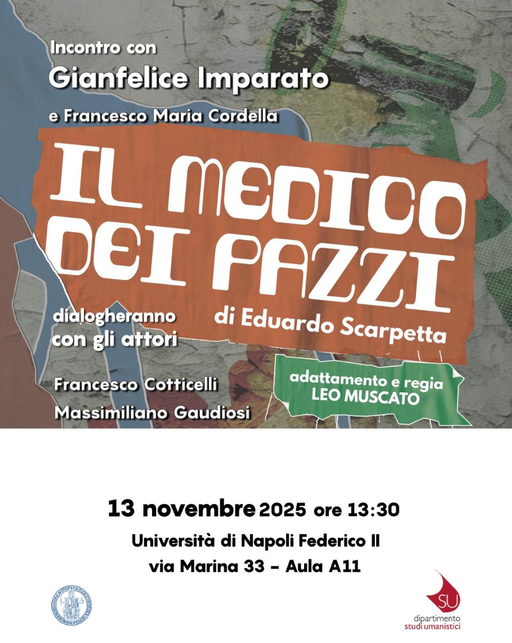 Giovedì 13 novembre 2025 alle 13.30 in aula A11 (via Marina 33) si svolgerà un incontro con gli attori Gianfelice ImparatoFrancesco Maria Cordella, in scena al Teatro San Ferdinando con "Il medico dei pazzi" per la regia di Leo Muscato in occasione del centenario dalla morte di Eduardo Scarpetta (29 novembre 1925). Con gli attori dialogheranno i docenti federiciani Massimiliano Gaudiosi e Francesco Cotticelli.