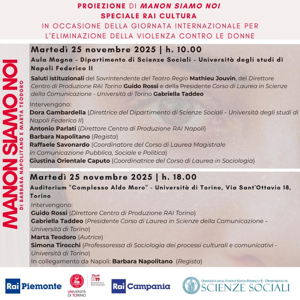 A Napoli, in contemporanea con la trasmissione tv, "Manon siamo noi" sarà proiettato e discusso con gli studenti da Dora Gambardella, Direttrice del Dipartimento di Scienze Sociali - Università degli Studi di Napoli Federico II; Mathieu Jouvin, sovrintendente Tearo Regio di Torino; Antonio Parlati, Direttore del Centro di Produzione Rai Napoli; Lello Savonardo, coordinatore del Corso di Laurea Magistrale in Comunicazione pubblica, sociale e politica – Dipartimento di Scienze Sociali, Università degli studi di Napoli Federico II; Barbara Napolitano, regista; Giustina Orientale Caputo, Coordinatrice del corso di laurea in Sociologia – Dipartimento di Scienze Sociali, Università degli Studi di Napoli Federico II.