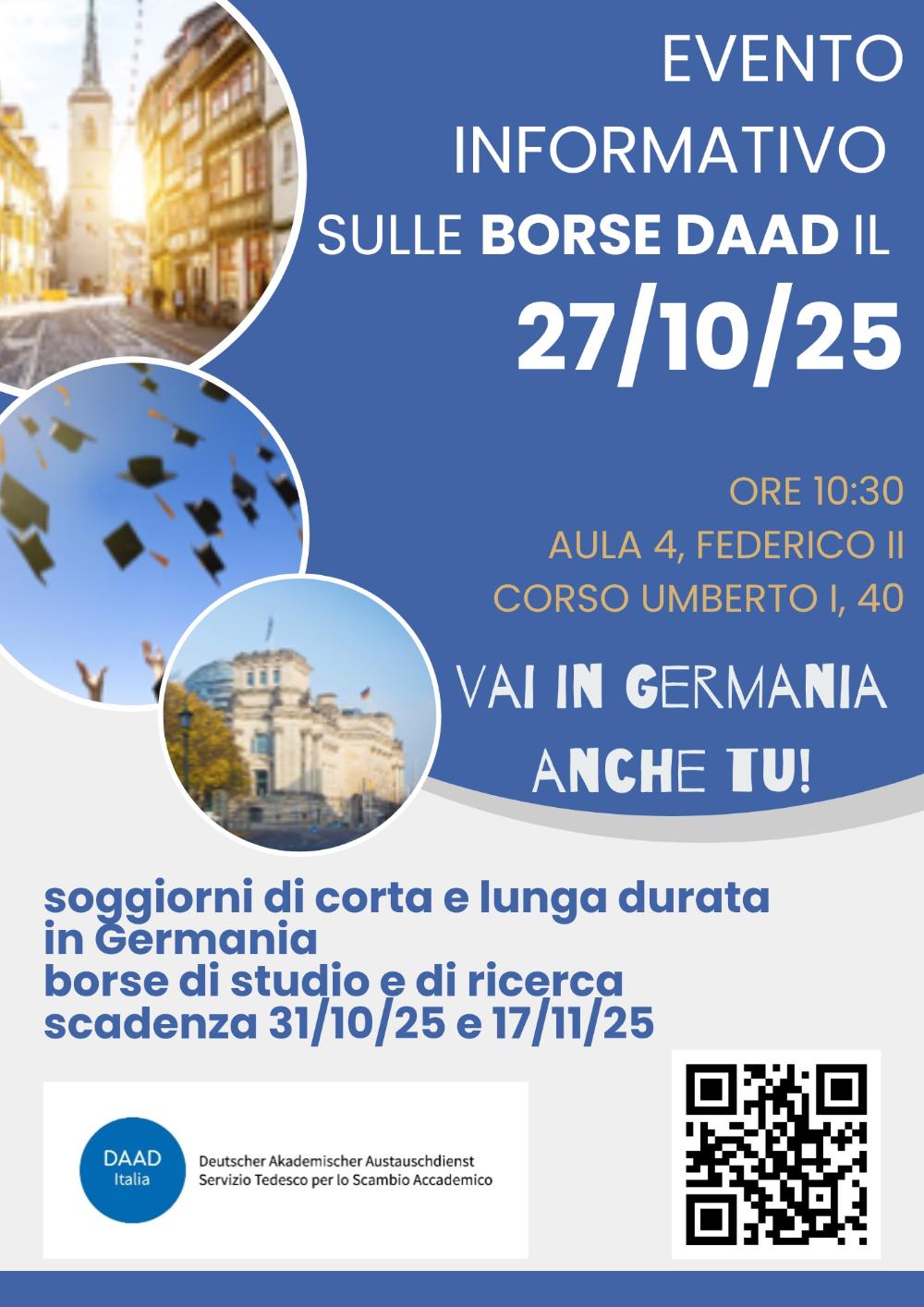 Lunedì, 27 ottobre 2025, alle ore 10.30, nell'aula 4 dell'Ateneo Federico II, in corso Umberto I, 40, si svolgerà l’annuale incontro dal titolo "Studio e ricerca in Germania. Incontro informativo per docenti e studenti universitari". La manifestazione verterà sulle opportunità di ricerca in Germania e sulle borse di studio fornite dal DAAD, il Servizio Tedesco per lo Scambio Accademico.