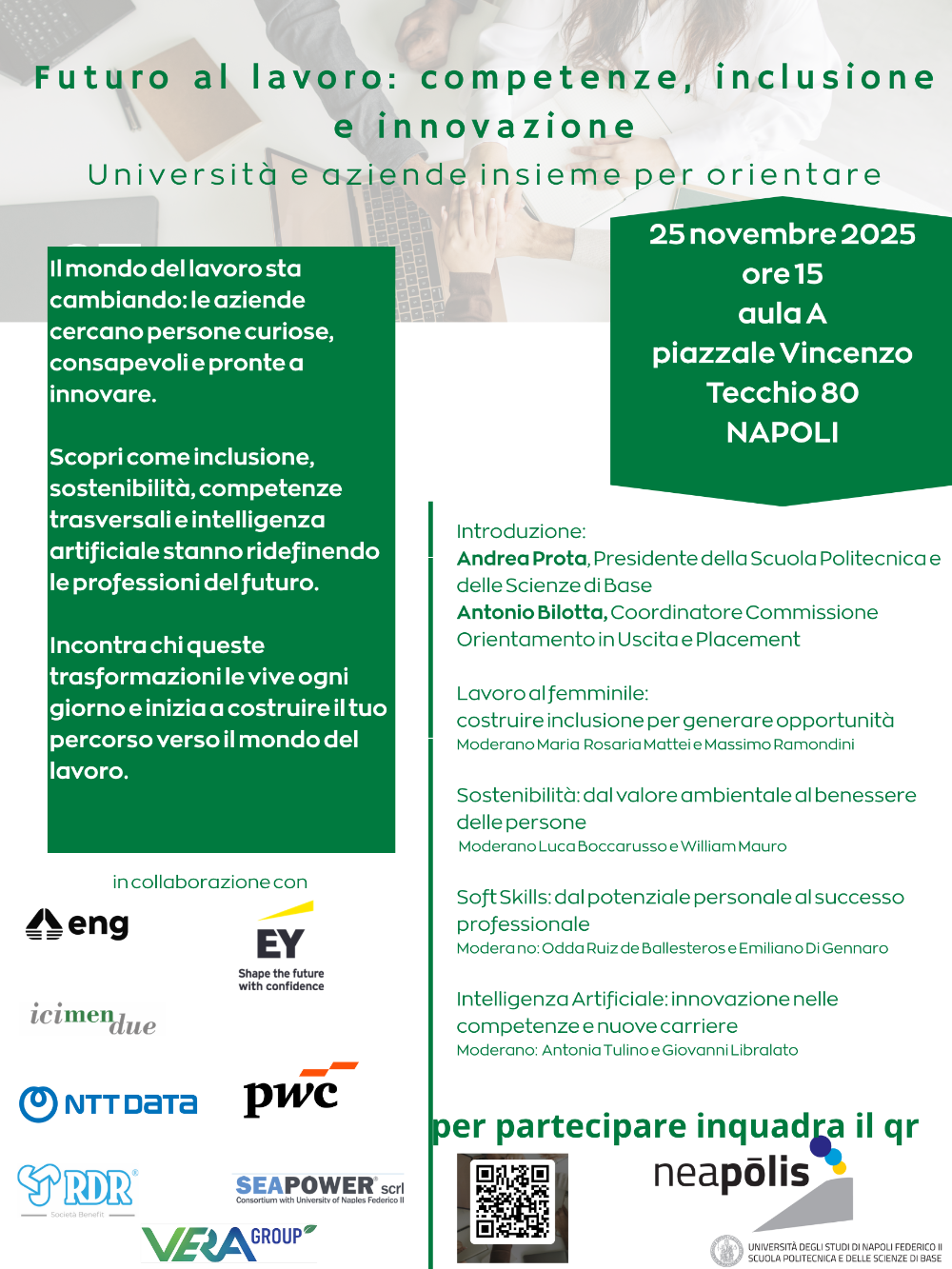 Il 25 novembre 2025 alle 15 nell’aula A della sede di piazzale V. Tecchio 80, l'ufficio orientamento della Scuola Politecnica e delle Scienze di Base della Federico II, con il contributo di alcune aziende leader, ha organizzato un incontro sui grandi temi del mondo del lavoro per comprenderne la rapida evoluzione e i nuovi trend.