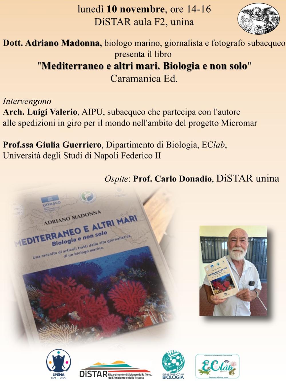 Un'occasione che prende spunto dalla presentazione del volume “Mediterraneo e altri mari. Biologia e non solo” di Adriano Madonna, biologo marino dell'EClab Laboratorio di Endocrinologia Comparata del Dipartimento di Biologia dell’Università degli Studi di Napoli Federico II, dove è responsabile del Processo ISM (Identificazione Specie Marine) e del Processo Tutela della Biodiversità.