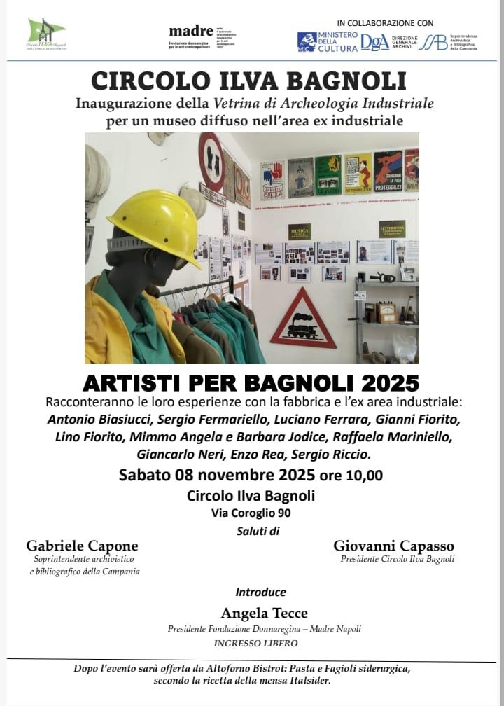 L’iniziativa, realizzata in collaborazione con il Circolo Ilva di Bagnoli, la Fondazione Donnaregina per le arti contemporanee – Museo Madre, il Ministero della Cultura, Direzione Generale Archivi e la Soprintendenza Archivistica e Bibliografica della Campania, rientra nel programma della manifestazione “Artisti per Bagnoli 2025”, che si propone di promuovere la nascita di un museo diffuso nell’ex area industriale, quale strumento di conoscenza, tutela e rilancio culturale del territorio.